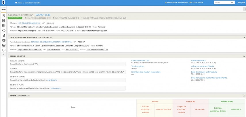 Serviciul de Ambulanță Județean Constanța a atribuit recent prin cumpărare directă un contract de Servicii telefonie fixa, internet, VPN.Potrivit LicitatiiPublica.ro, valoarea contractului este de 40.614,48 RON și a fost atribuit societății ORANGE ROMANIA.