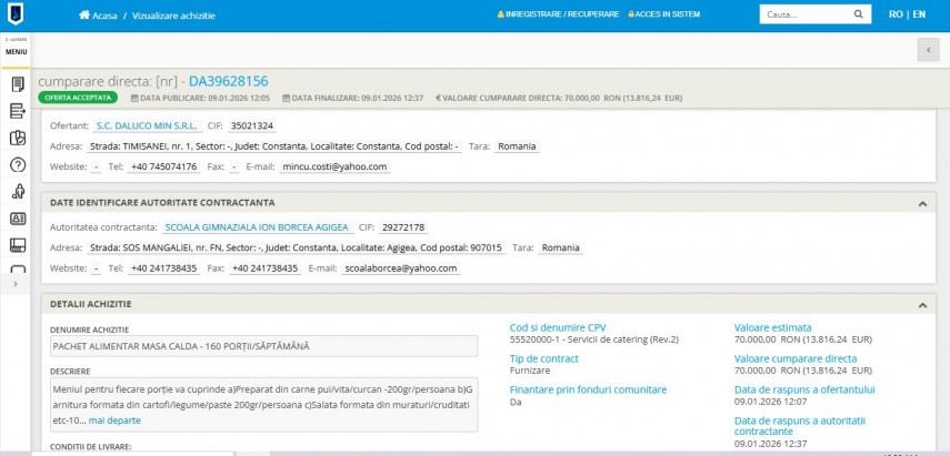 Cel mai recent contract este cel la care făceam referire în rândurile de mai sus, finalizat în data de 9 ianuarie 2026 și vizând furnizarea de pachete alimentare tip masă caldă, în cadrul procedurii cu numărul DA39628156. Achiziția are o valoare estimată de 70.000 de lei și se încadrează în categoria servicii de catering (CPV 55520000).