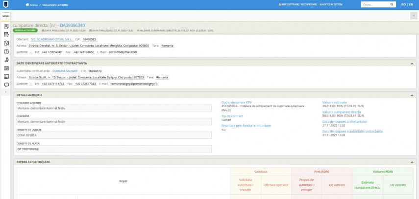 Cumpărări Directe Constanța Societatea Adrisimo 27 va asigura iluminatul festiv în comuna Saligny, județul Constanța (DOCUMENT)