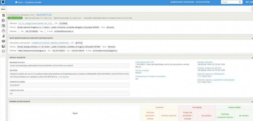 Primăria Comunei 23 August județul Constanța a atribuit recent prin cumpărare directă un contract de studiu de fezabilitate Amenajare zona recreere localitatea 23 August. Potrivit LicitatiaPublica.ro, contractul în valoare de 100.000 de lei a fost atribuit societății S.C. Design Proiect Studio S.R.L.Documentația va fi realizată conform HG 907/2016 și va include :