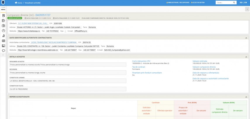 Liceul Tehnologic „Nicolae Dumitrescu“ Cumpăna județul Constanța a atribuit recent prin cumpărare directă un contract de achiziție tricou personalizat cu mânecă scurtă Tricou personalizat cu mânecă lungă.Potrivit LicitatiaPublica.ro, contractul a fost atribuit societății Flony New System S.R.L. și este în valoare de 100.000 de lei.