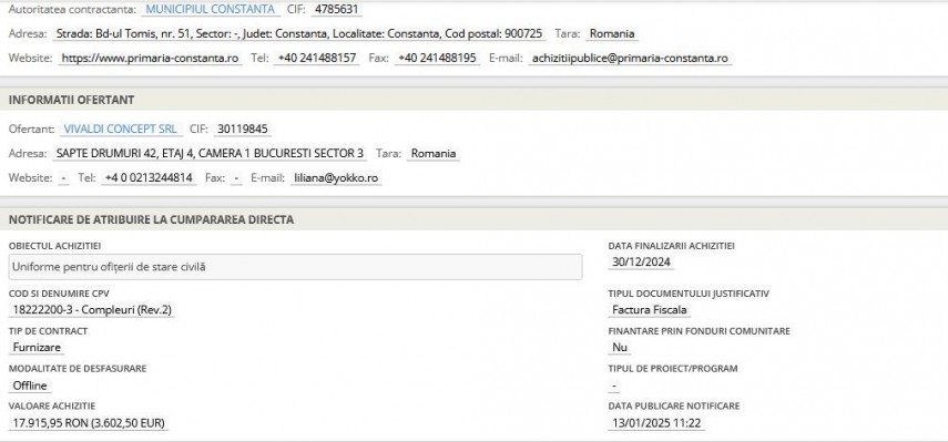 Cumpărări directe Vivaldi Concept SRL livrează uniformele pentru ofițerii de stare civilă din municipiul Constanța (DOCUMENT)