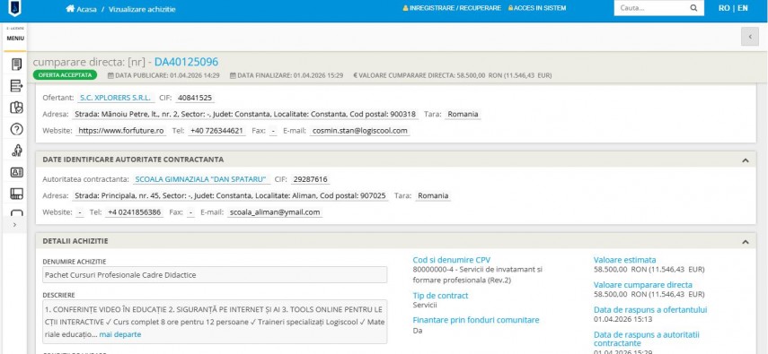 Cadrele didactice de la Școala Gimnazială „Dan Spătaru” din localitatea Aliman, județul Constanța vor beneficia de un program de formare profesională. Unitatea de învățământ a finalizat recent o achiziție directă în valoare de 58.500 lei, având ca obiect un pachet complex de cursuri menite să modernizeze actul educațional.