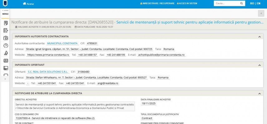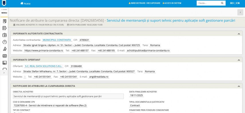 Primăria Municipiului Constanța a finalizat pe 18.11.2025 două achiziții directe importante pentru asigurarea continuității serviciilor digitale ale orașului. Ambele contracte au fost atribuite societății locale SC Real Data Solutions SRL și vizează suportul tehnic pentru platformele de gestionare a parcărilor și a contractelor domeniului public.