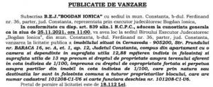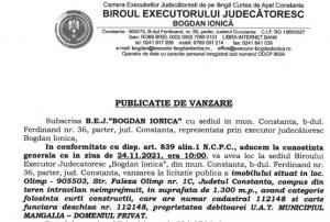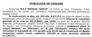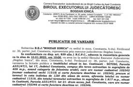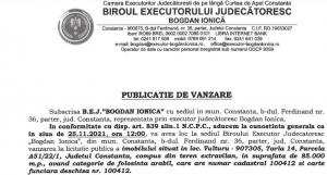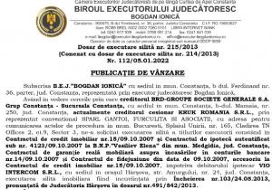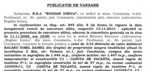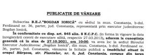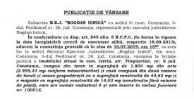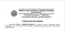 - B.E.J. Bogdan Ionica, cu sediul în municipiul Constanța, anunță organizarea unei licitații pentru valorificarea unui bun imobil deținut de debitorul Vișan Mircea cu domiciliul în Constanța.