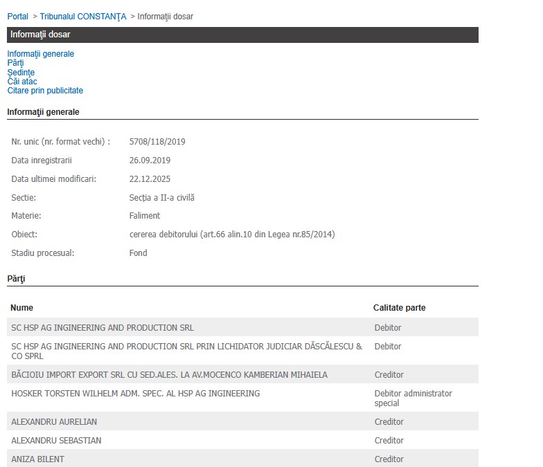 După multiple amânări ale procesului, în data de 08.12.2025, instanța a dispus intrarea în procedura falimentului a debitoarei HSP-AG Ingineering and Production SRL.