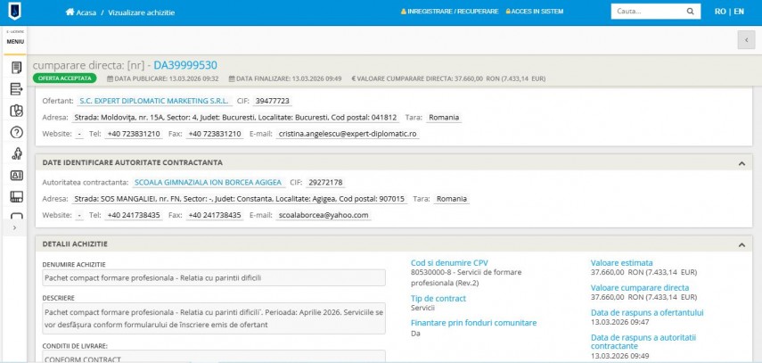 Școala Gimnazială „Ion Borcea” din Agigea a finalizat recent o achiziție directă pentru un program specializat de formare profesională destinat cadrelor didactice. Proiectul, intitulat „Pachet compact formare profesională - Relația cu părinții dificili”, vizează îmbunătățirea competențelor de comunicare și gestionare a conflictelor în mediul școlar.Contractul a fost atribuit societății Expert Diplomatic Marketing SRL din București, valoarea contractului ridicându-se la 37.660 lei.