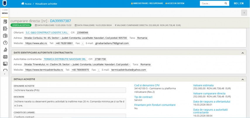 Termica Distribuție Năvodari SRL a finalizat o procedură de achiziție directă prin intermediul sistemului electronic SEAP, vizând închirierea de utilaje specializate pentru intervenții la înălțime. Contractul a fost atribuit societății locale G&G Construct Logistic, valoarea estimată a serviciilor ridicându-se la 252.000 lei.