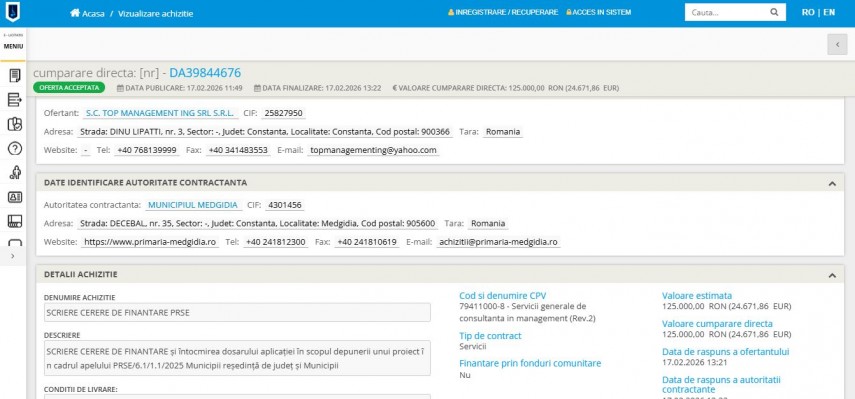 Contractul a fost adjudecat de firma Top Management Ing SRL din Constanța. Obiectul principal al achiziției îl reprezintă scrierea cererii de finanțare și întocmirea dosarului complet pentru un proiect ce urmează a fi depus în cadrul apelului PRSE/6.1/1.1/2025, dedicat municipiilor.