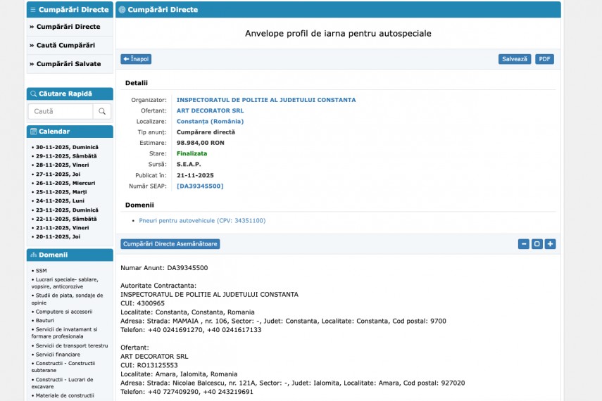 Inspectoratul de poliție Județean (IPJ) Constanța a atribuit un contract prin cumpărare directă privind achiziția unor anvelope cu profil de iarnă, de diverse mărimi pentru autospecialele de poliție, pentru dotarea autospecialelor de poliție, în vederea desfășurării în bune condiții a activităților specifice.