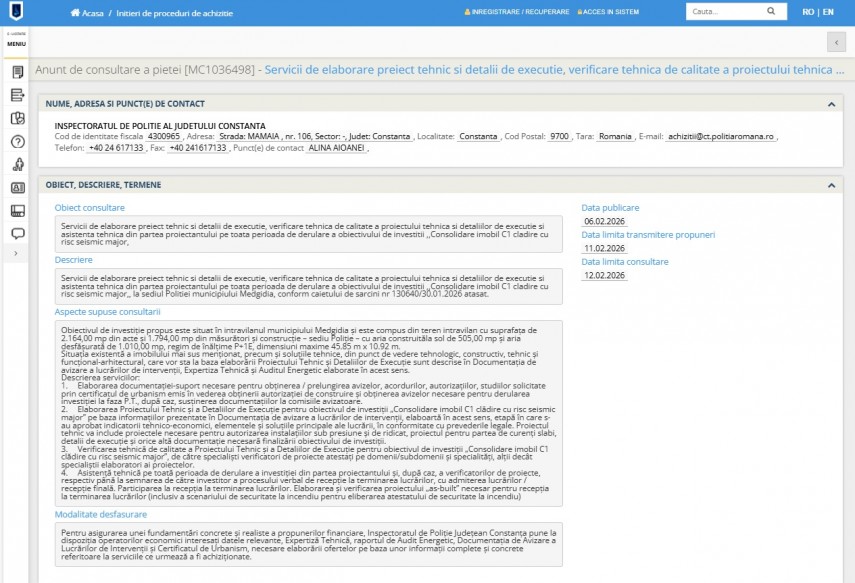 Inspectoratul de Poliție Județean (IPJ) Constanța consultă piața în vederea iniţierii unei proceduri privind achiziția de servicii de elaborare preiect tehnic și detalii de execuție, verificare tehnică de calitate a proiectului tehnic și detaliilor de execuție și asistenta tehnică din partea proiectantului pe toată perioada de derulare a obiectivului de investiții ,,Consolidare imobil C1 clădire cu risc seismic major”.