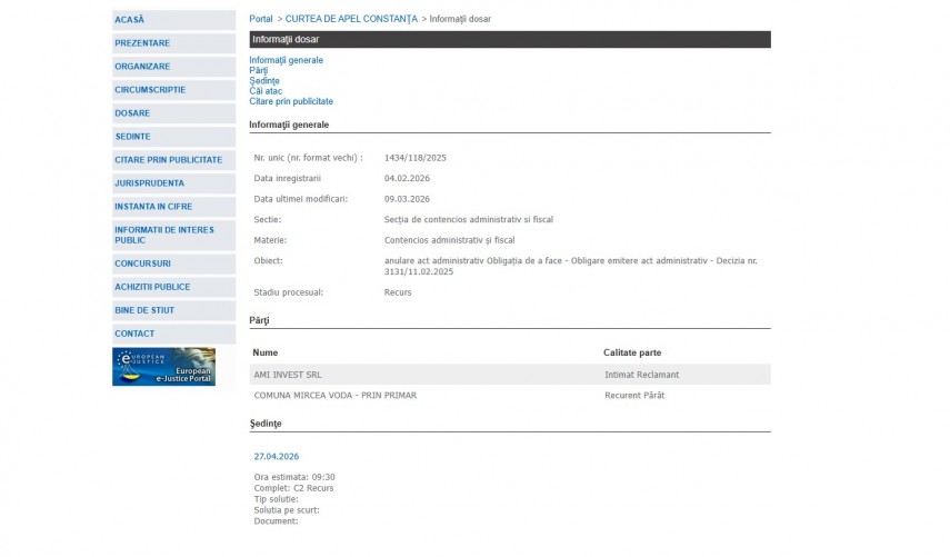 Justiție Constanța Termen în aprilie 2026 la Curtea de Apel Constanța în disputa juridică dintre Ami Invest SRL și Primăria Mircea Vodă