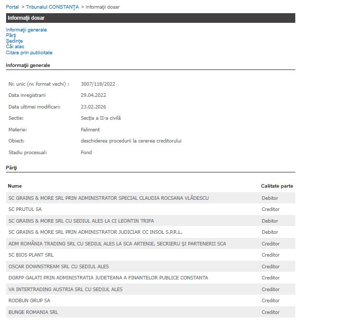Dosarul de insolvență al societății Grains & More SRL, aflat pe rolul Tribunalului Constanța încă din anul 2022, a primit un nou termen de judecată. Instanța a amânat cauza pentru primăvara acestui an, în așteptarea unor clarificări privind evaluarea activelor debitoarei.