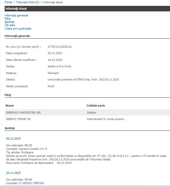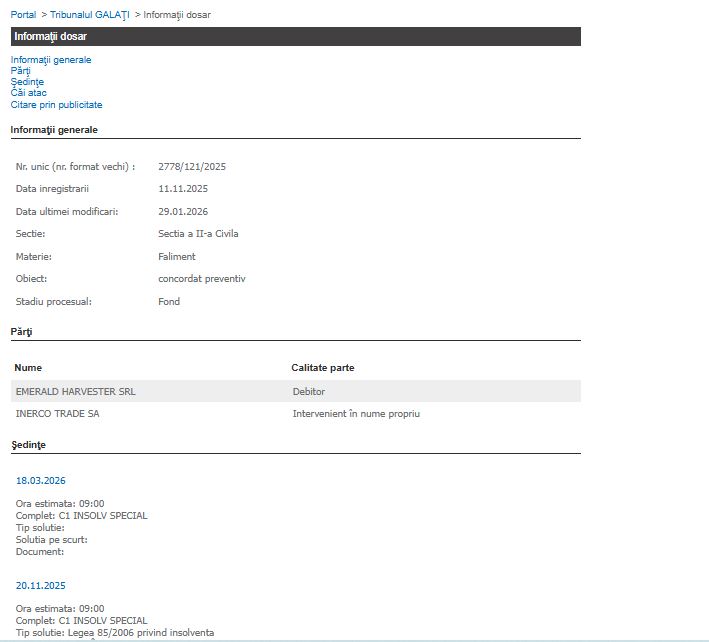 În noiembrie 2025, Tribunalul Galați admisese cererea Emerald Harvester SRL, deschizând procedura de concordat și desemnând un administrator provizoriu pentru elaborarea unui plan de redresare. La acea vreme, instanța dispusese suspendarea tuturor executărilor silite pentru o perioadă de 4 luni.