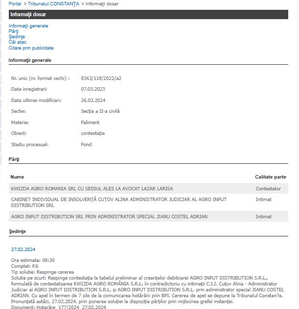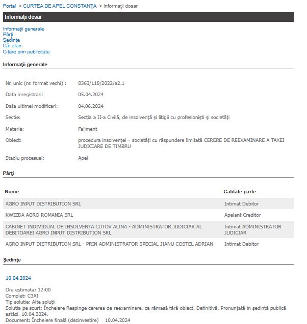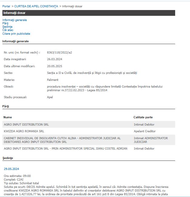 În cadrul dosarului de faliment (nr. 8363/118/2022/a2), magistrații Curții de Apel au decis pe 29 mai 2024 să admită apelul formulat de Kwizda Agro, schimbând total sentința primei instanțe. Astfel, judecătorii au dispus înscrierea creditoarei în tabelul definitiv de creanțe cu suma de 1.427.026,77 lei.