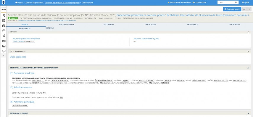Compania Națională Administrația Canalelor Navigabile SA Constanța a atribuit prin procedură simplificată un contract de supervizare proiectare și execuție pentru" Reabilitare taluz afectat de alunecarea de teren (calamitate naturala) zona Cumpăna – mal stâng Canal Dunăre-Marea Neagra, în proximitatea descărcătoarelor D20 ȘI D21, Etapa a-III-a - Lucrări în Prima Urgență".Potrivit LicitatiaPublica.ro, contractul în valoare de 389.740 de lei a fost atribuit societății Stereogis Proiect SRL.