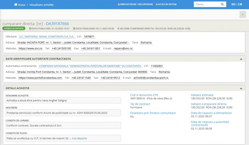 Potrivit LicitatiaPublica.ro, contractul a fost atribuit societății Șantierul Naval Constanța SA, iar valoarea contractului se ridică la suma de 183.552,00 RON.