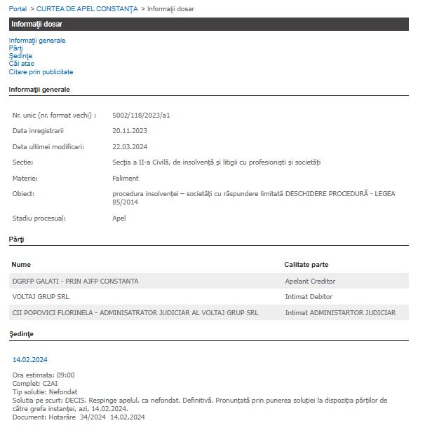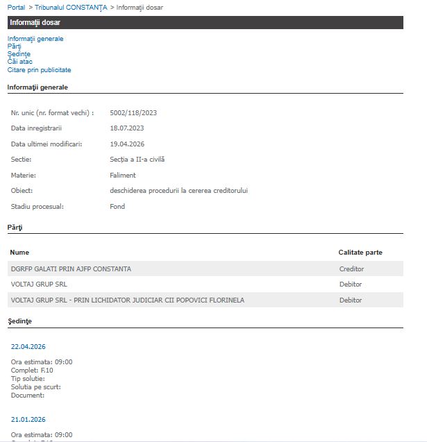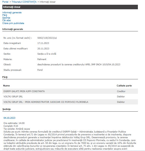 În vara anului 2023, DGRFP Galați prin AJFP Constanța a solicitat în instanță deschiderea procedurii de insolvență a debitoarei Voltaj Grup SRL, în dosarul 5002/118/2023.
