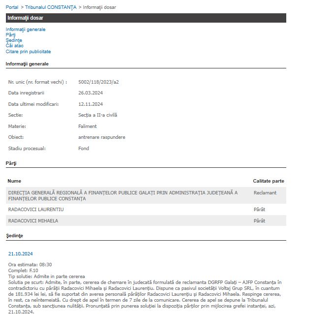 Un aspect important al acestui caz a fost dosarul asociat (5002/118/2023/a2), având ca obiect „antrenarea răspunderii”. Fiscul a solicitat ca datoriile firmei să fie achitate de foștii administratori, Radacovici Laurențiu și Radacovici Mihaela.