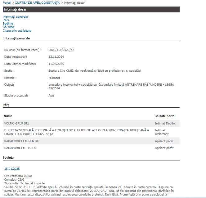 „Soluția pe scurt: DECIS. Admite apelul. Schimbă în parte sentinţa apelată, în sensul că: Admite în parte cererea. Dispune ca suma de 75.462 lei, reprezentând parte din pasivul debitoarei Voltaj Grup SRL, să fie suportat din patrimoniul pârâţilor, în solidar. Menţine restul dispoziţiilor privind respingerea celorlalte pretenţii. Definitivă. Pronunţată prin punerea soluţiei la dispoziţiapărţilor prin grefa instanţei, azi 15.01.2025.
