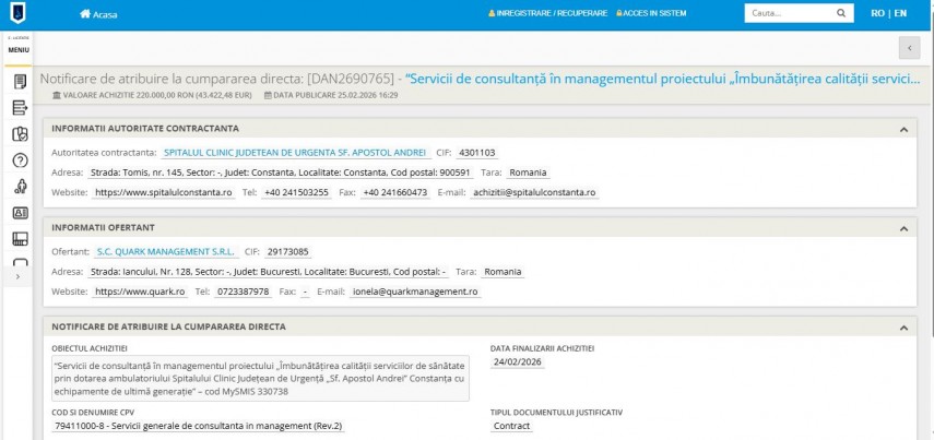 Cinci contracte prin cumpărare directă pentru Quark Management SRL, atribuite de Spitalul Județean Constanța