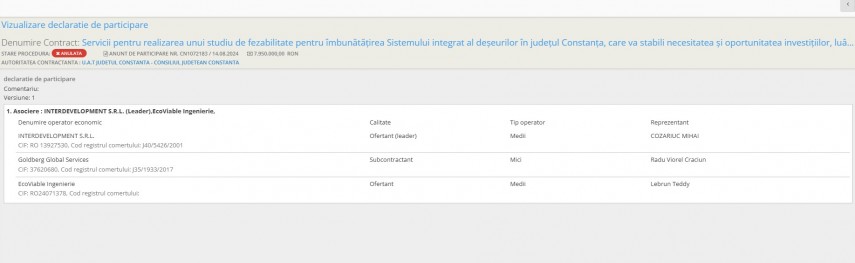 Licitația pentru servicii pentru realizarea unui studiu de fezabilitate pentru îmbunătățirea Sistemului integrat al deșeurilor în județul Constanta, care va stabili necesitatea și oportunitatea investițiilor, luându-se în considerare să nu fie dublă finanțare sau ajutor de stat - asistență tehnică și consultant, a fost anulată. Potrivit LicitatiaPublica.ro, motivul anulării îl reprezintă imposibilitatea încheierii contractului cf art.212 alin. (1) lit. c) din Legea nr.98/2016, cu modificările și completările ulterioare, având în vedere clauza suspensivă existentă în cadrul documentației de atribuire (imposibilitatea obținerii finanțării până la data estimată pentru semnarea contractului de finanțare, și anume 31.12.2025, așa cum rezultă din răspunsul MIPE comunicat prin adresa nr.106484/06.10.2025)Valoarea estimată a contractului era de 7.950.000 RON.