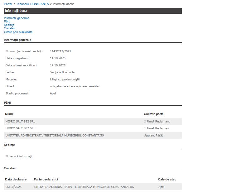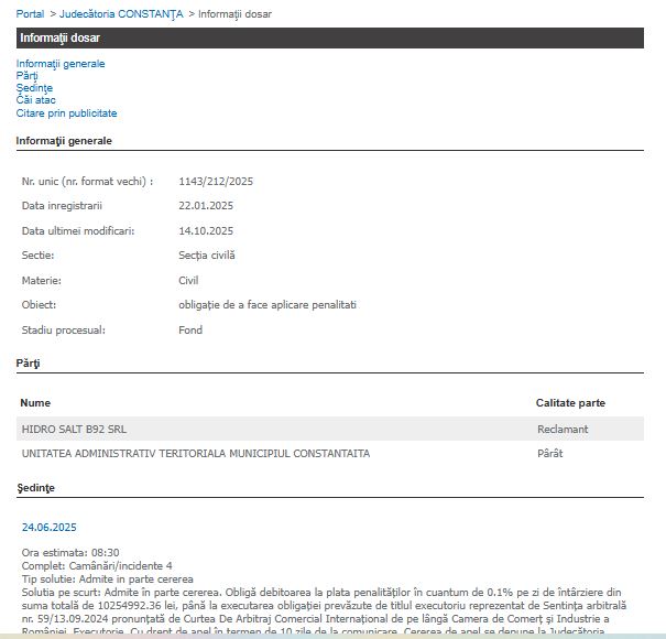 Un nou capitol se scrie în disputa legală dintre societatea Hidro Salt B92 SRL și Unitatea Administrativ-Teritorială Municipiul Constanța, după ce Judecătoria Constanța a decis, pe 24 iunie 2025, obligarea Primăriei la plata unor penalități de întârziere.