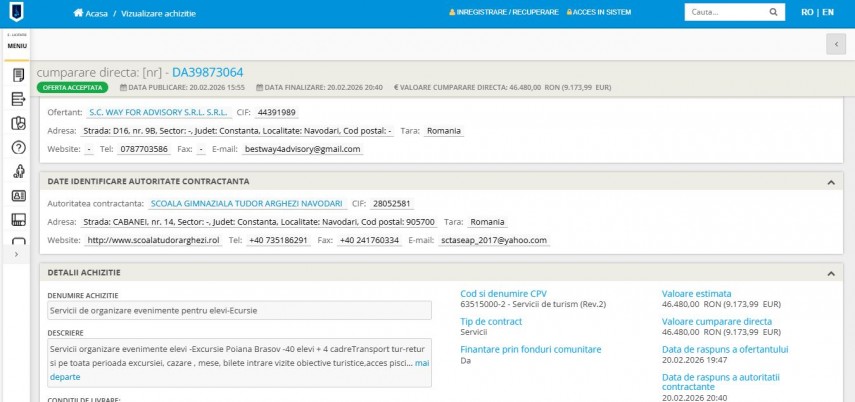 Prima achiziție, în valoare de 46.480 lei, vizează organizarea unei excursii la Poiana Brașov. Programul este destinat unui grup de 40 de elevi însoțiți de patru cadre didactice.