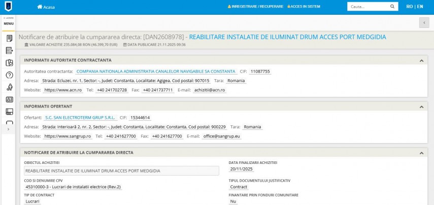 Compania Națională Administrația Canalelor Navigabile SA Constanța a finalizat o achiziție publică prin cumpărare directă pentru reabilitarea instalației de iluminat a drumului de acces către Portul Medgidia, în valoare estimată de 235.084 lei.
