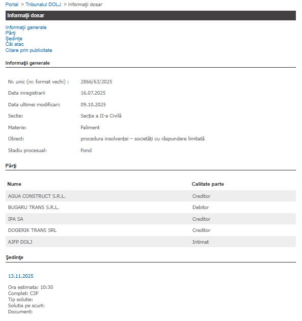 La Tribunalul Dolj, în cadrul Secției a II-a Civile, se află în desfășurare un dosar de insolvență înregistrat sub numărul 2866/63/2025, având ca obiect procedura insolvenței unei societăți cu răspundere limitată. Cauza a fost introdusă pe rol în data de 16 iulie 2025 și se află în prezent în faza procesuală de fond.