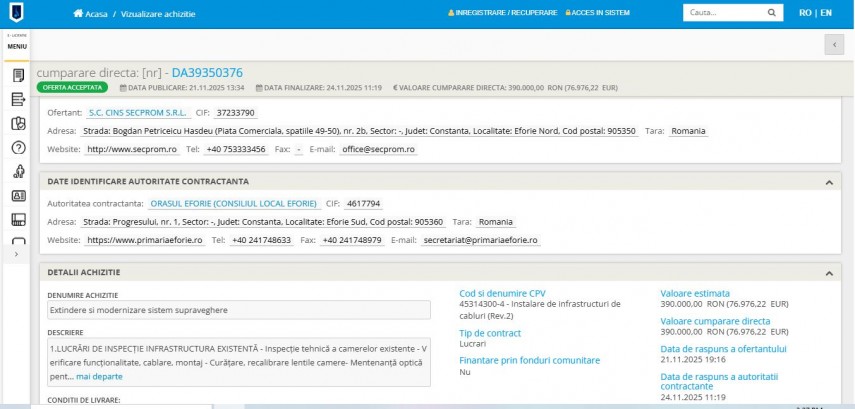 •Servicii de mentenanță pentru sistemul de supraveghere video – finalizate în 29 iulie 2025, valoare 32.500 lei, pentru asigurarea funcționalității echipamentelor existente.