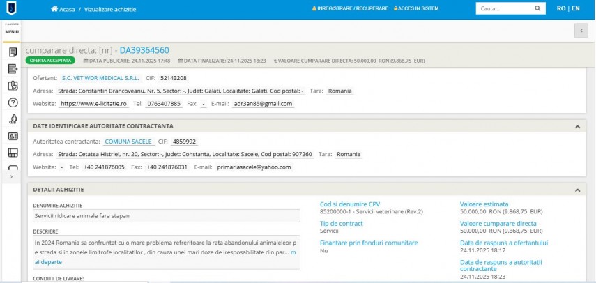 Primăria Săcele din județul Constanța a finalizat achiziția directă a serviciilor de ridicare a animalelor fără stăpân, în valoare de 50.000 lei.