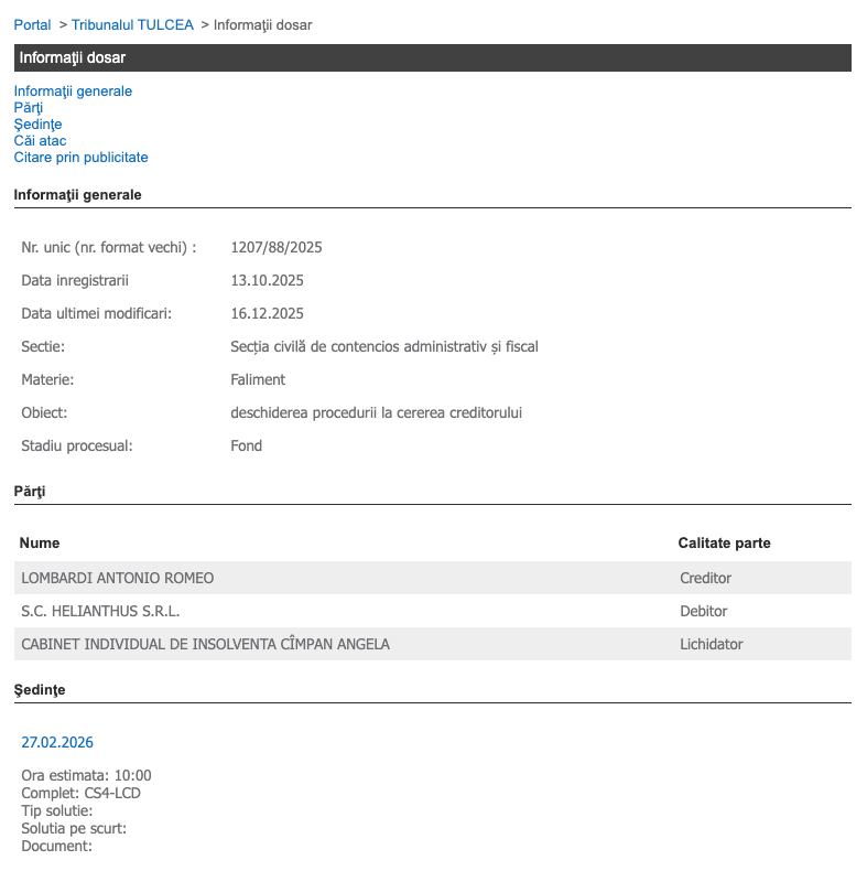 Pe rolul Tribunalului Tulcea se află dosarul 1207/88/2025, înregistrat la data de 13.10.2025 la Secţia civilă de contencios administrativ şi fiscal ce are ca obiect „deschiderea procedurii la cererea creditorului “. Procesul se află în stadiul de fond, iar ultima modificare a fost operată în data de 16.12.2025.
