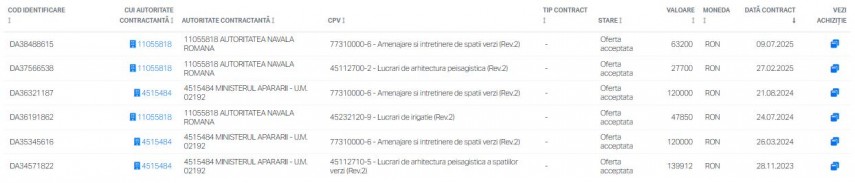 Primăria Chirnogeni din județul Constanța a finalizat procesul de achiziție pentru serviciile de întreținere a spațiilor verzi din comună. Contractul, atribuit prin cumpărare directă pe data de 29 aprilie 2026, vizează înfrumusețarea și îngrijirea zonelor verzi pe parcursul întregului an, suma alocată fiind de peste 134.000 de lei.Conform datelor oficiale din Sistemul Electronic de Achiziții Publice, Primăria Chirnogeni a atribuit contractul societății SC Garden Antoniewicz SRL, cu sediul în Eforie Nord.