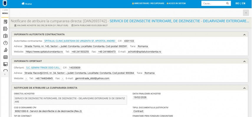 Contracte între Gemini Trade DDD SRL și Spitalul Clinic Județean de Urgență „Sf. Apostol Andrei” Constanța