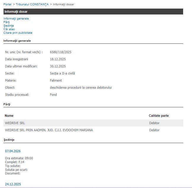 Administratorul judiciar al Wedrive SRL a anunțat deschiderea procedurii de insolvență, conform dosarului nr. 6580/118/2025, aflat pe rolul Tribunalului Constanța. Procedura a fost deschisă la data de 24 decembrie 2025, iar anunțul a fost publicat în presa națională la 12 ianuarie 2026.