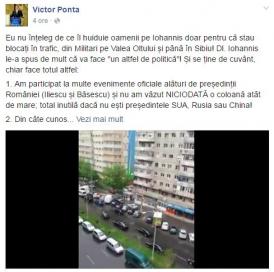 "Îmi permit să afirm că Victor Ponta este un pericol pentru România, pentru democraţia din România, prin modul în care ştie să conducă propriul partid şi felul cum reacţionează la problemele societăţii şi cum vrea să deturneze natura problemelor. Este un pericol pentru economia românească, promite pomeni în stânga şi dreapta, dar este incapabil să prezinte proiectul de buget pe 2015, aceste lucruri duc la împovărarea populaţiei, economia se va contracta, iar în 2015 vom plăti nota de plată pentru campania electorală deşănţată a lui Ponta. Este un pericol pentru orientarea pro-occidentală şi euro-atlantică a României, prin felul în care conduce Guvernul şi, Doamne fereşte, ar conduce şi statul, ne îndepărtează de idealurile care ne leagă de partenerii noştri din Europa şi SUA", a spus Iohannis.