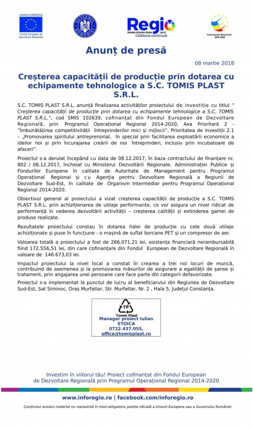 Anunț de presă Creșterea capacității de producție prin dotarea cu echipamente tehnologice a S.C. TOMIS PLAST S.R.L.