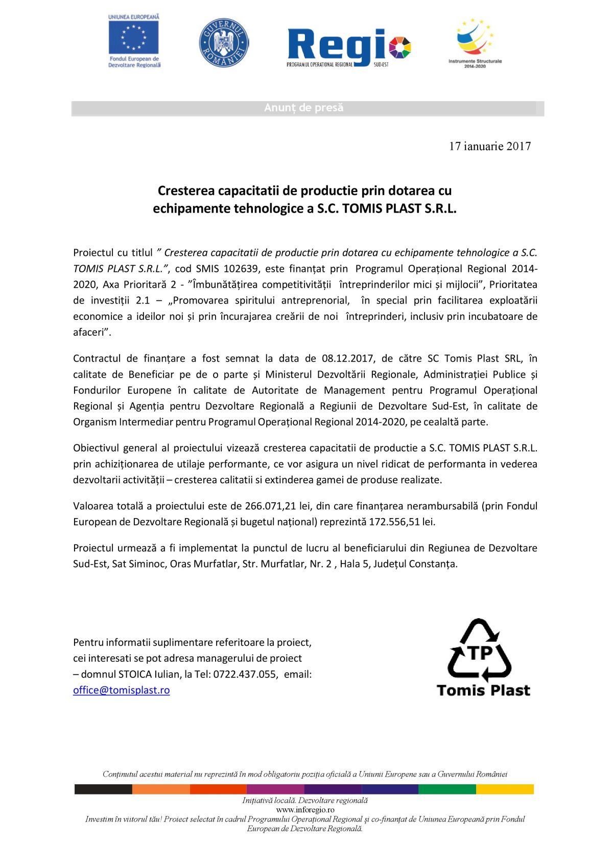 Anunt de presa Creşterea capacităţii prin dotarea cu echipamente tehnologice a S.C. TOMIS PLAST S.R.L.
