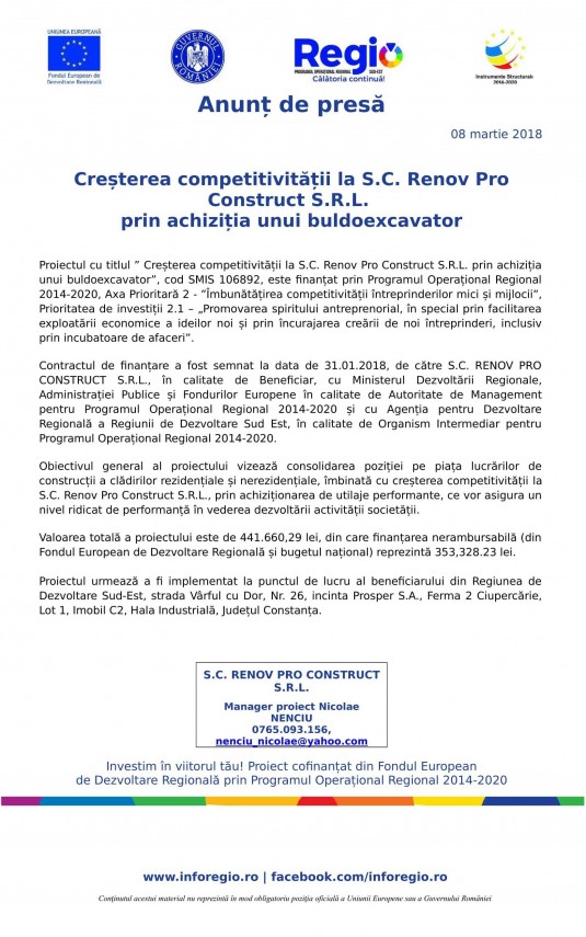 Anunț de presă Creșterea competitivității la S.C. Renov Pro Construct S.R.L. prin achiziția unui buldoexcavator