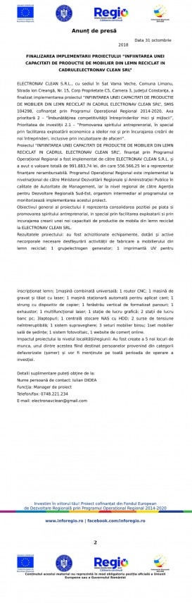Anunț de presă Finalizarea implementării proiectului "Înființarea unei capacități de producție de mobilier din lemn reciclat în cadrul ELECTRONAV CLEAN SRL"