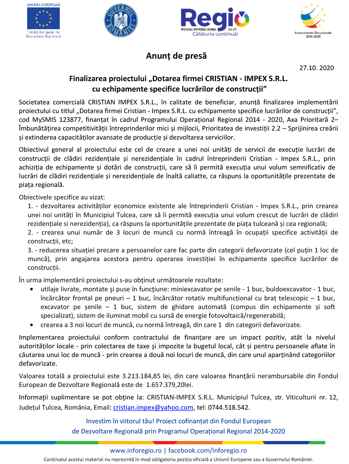 Anunț de presă Finalizarea proiectului „Dotarea firmei CRISTIAN - IMPEX S.R.L. cu echipamente specifice lucrărilor de construcții”