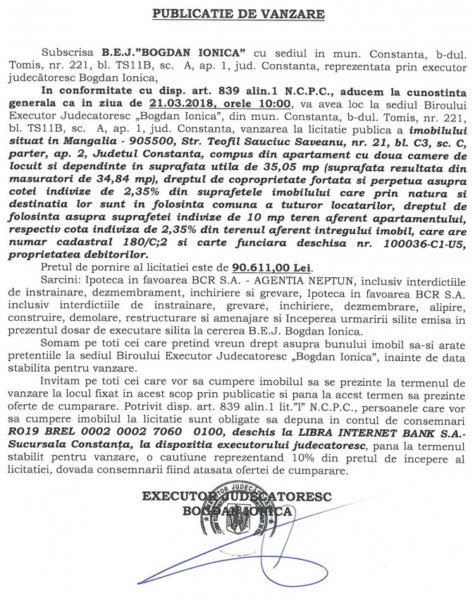 B.E.J. "Bogdan Ionică" organizează licitație publică în vederea vânzării unui imobil din Mangalia