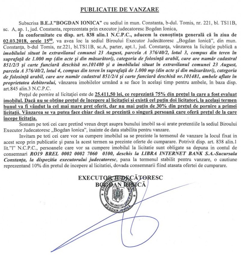 B.E.J. "Bogdan Ionică" organizează licitație publică în vederea vânzării unui imobil situat in extravilanul comunei 23 August