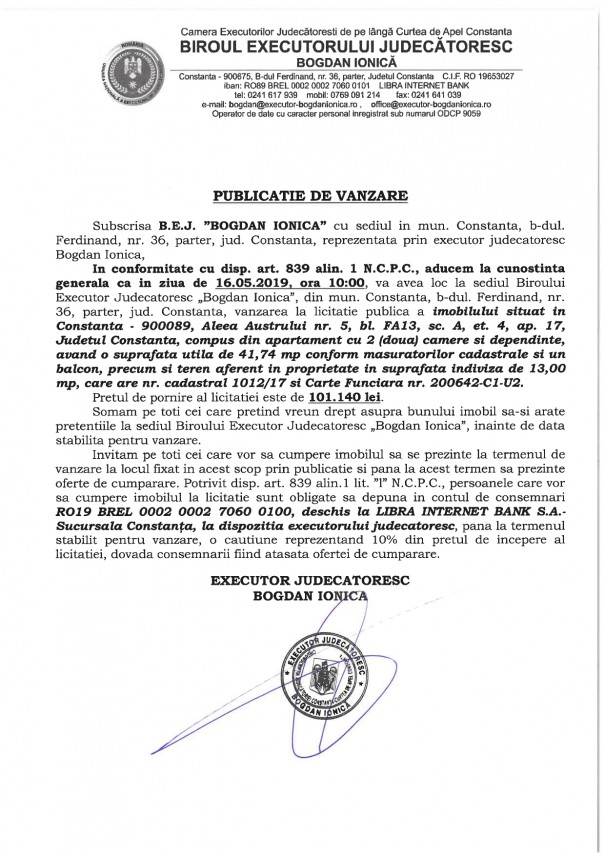 B.E.J. “Bogdan Ionică” scoate la licitație publică un imobil situat in Constanța