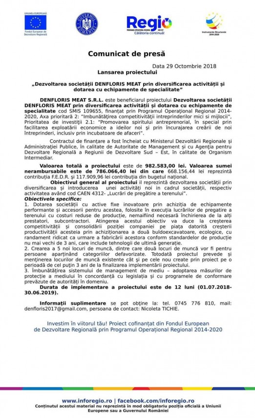Lansarea proiectului: „Dezvoltarea societății DENFLORIS MEAT prin diversificarea activității și dotarea