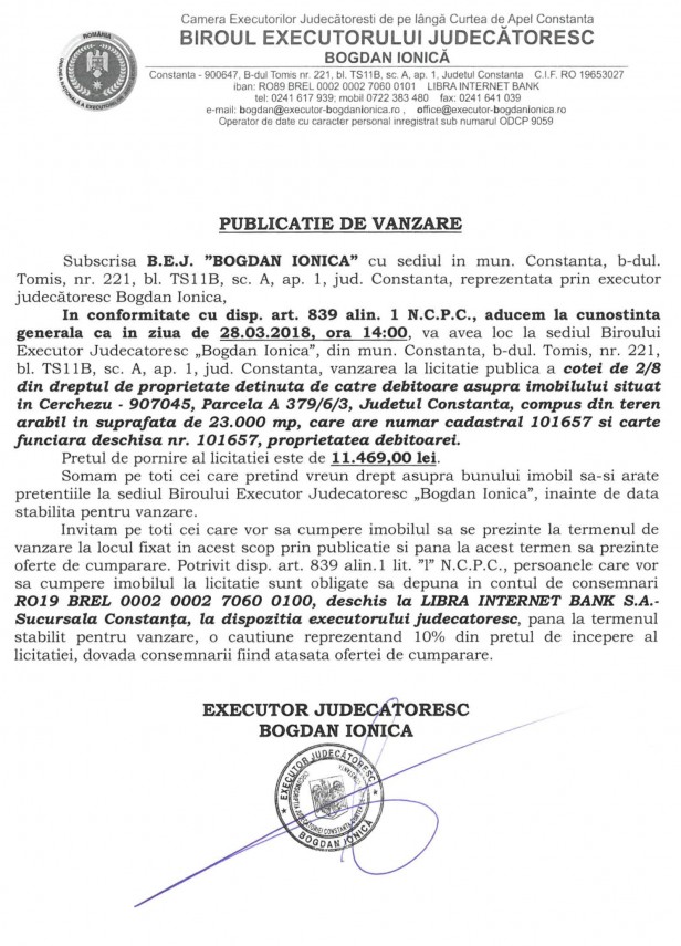 Licitație publică organizată de B.E.J. "Bogdan Ionică" în vederea vânzării unei cote din dreptul de proprietate