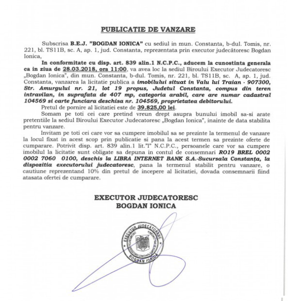 Licitație publică organizată de B.E.J. "Bogdan Ionică" în vederea vânzării unui imobil din Valu lui Traian,
