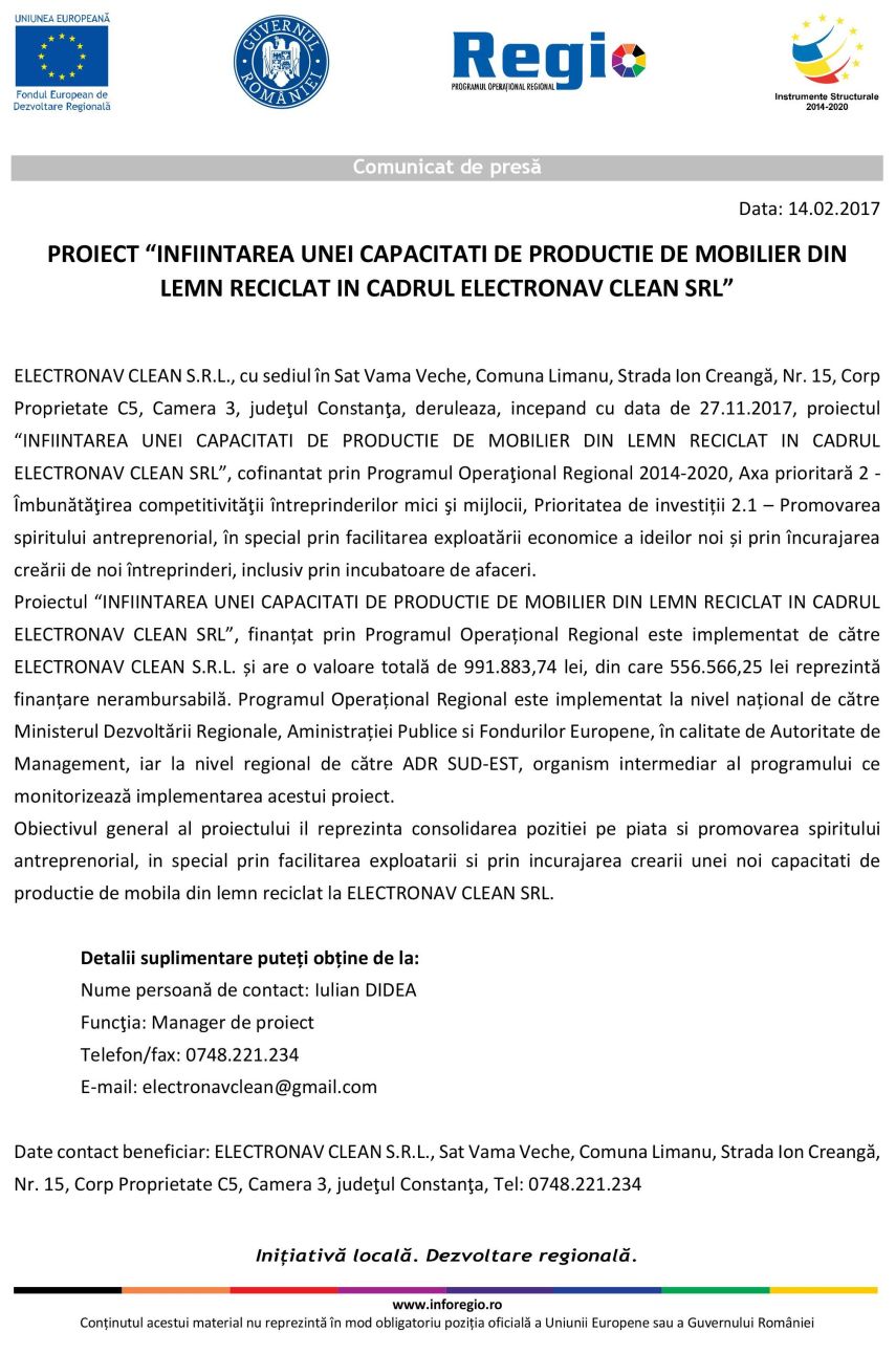 Comunicat de presă Proiect “Inființarea unei capacități de producție de mobilier din lemn reciclat în cadrul ELECTRONAV CLEAN SRL”