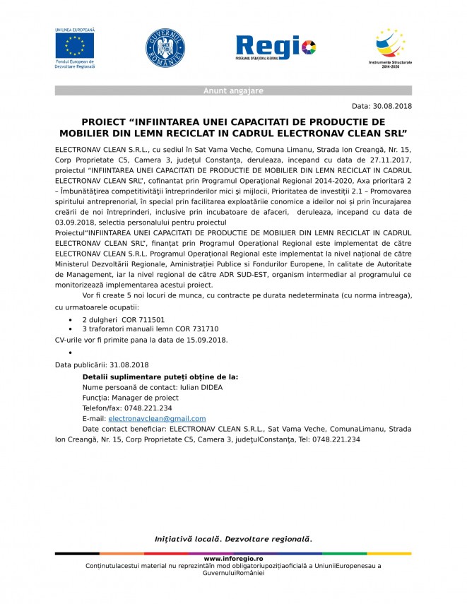 PROIECT “INFIINTAREA UNEI CAPACITATI DE PRODUCTIE DE MOBILIER DIN LEMN RECICLAT IN CADRUL ELECTRONAV CLEAN SRL”